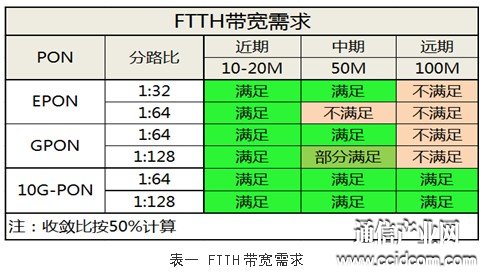 近期10-20M,中期50M;國(guó)內(nèi)FTTH主要選擇GPON+1∶64,可以滿足近/中期需求;GPON 1∶128在節(jié)省主干光纖的情況下,部分滿足中期50M提速需求,可以作為一種建網(wǎng)選擇;遠(yuǎn)期100M的帶寬需求,可以通過(guò)升級(jí)到10G-PON來(lái)滿足。