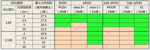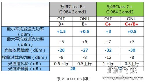 目前大部分廠商GPON線卡都可以支持1∶128大分光比,如華為、烽火OLT均可以進(jìn)行擴(kuò)展,并在前期進(jìn)行了相關(guān)驗(yàn)證。OLT側(cè)Class C+標(biāo)準(zhǔn)由聯(lián)通和電信定義(表2列出了Class C+標(biāo)準(zhǔn)的相關(guān)參數(shù))。