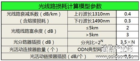 接下來(lái),通過(guò)實(shí)際模型來(lái)計(jì)算∶,C+光模塊在大分光比應(yīng)用中是否能達(dá)到要求(表3和表4給出了實(shí)際模型的相關(guān)參數(shù))??梢钥吹?,按圖中的模型參數(shù)計(jì)算,1∶128+C+可以支持到5km覆蓋半徑。另外,如果考慮到以后的網(wǎng)絡(luò)演進(jìn),在進(jìn)行1∶128大分光比應(yīng)用中采用C+光模塊,未來(lái)GPON演進(jìn)到XG-PON時(shí),需選用E1的大功率光模塊,成本較高。