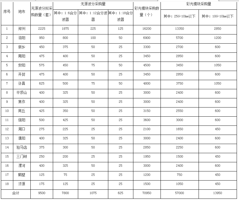 根據(jù)此前招標公告,本次招標內(nèi)容共9500套無源波分復用設備,70950個彩光模塊及安裝配件輔材;其中:1:6合分波器7800套,1:12合分波器1075套,1:18合分波器625套),25G彩光模塊57000個,10G彩光模塊13950個。