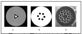 光子晶體光纖采用空氣與石英玻璃復(fù)合的材料結(jié)構(gòu),該結(jié)構(gòu)可以大幅度提高纖芯與包層之間較大的折射率反差,這種結(jié)構(gòu)可以很好地將光波電磁場嚴(yán)格限制在光纖芯中。圖1是3種典型的不同結(jié)構(gòu)的FTTH用光子晶體光纖。