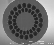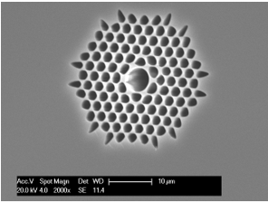 光子晶體光纖的結(jié)構(gòu)與常規(guī)光纖迥然不同,普通的光纖是由實(shí)體的纖芯和包層構(gòu)成的,而光子晶體光纖的包層由空氣孔和石英構(gòu)成,空氣孔在纖芯的外圍以正六邊形的樣子規(guī)則排列。石英-空氣復(fù)合結(jié)構(gòu)的光子晶體光纖大折射率反差、高度可控制的周期性折射率變化,為光的傳導(dǎo)與控制提供了新的機(jī)理及途徑。光子晶體光纖具有許多獨(dú)特而神奇的物理特性:可控的非線性、無盡單模特性、可調(diào)節(jié)的奇異色散、低彎曲損耗、大模場等,這些特性是常規(guī)石英單模光纖很難或無法實(shí)現(xiàn)的,因此,光子晶體光纖引起了科學(xué)工作者的濃厚興趣,并開展了深入的理論與試驗(yàn)研究。