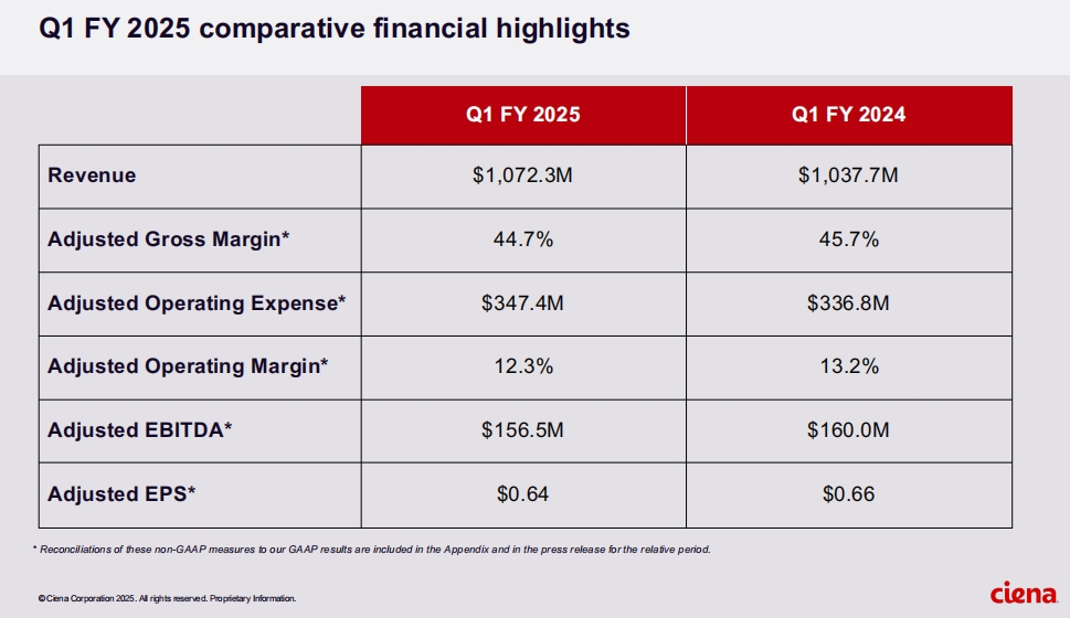 ICC訊 Ciena公布了截至 2025年2月1日的2025財(cái)年第一財(cái)季財(cái)務(wù)業(yè)績。
