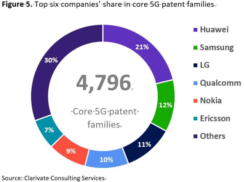 5G核心標(biāo)準(zhǔn)必要專利的持有量方面,華為、三星、LG、高通、諾基亞和愛立信等6家公司合計(jì)占比達(dá)到70%。不出意外,華為以21%擁有量的絕對(duì)優(yōu)勢(shì)位居榜首。