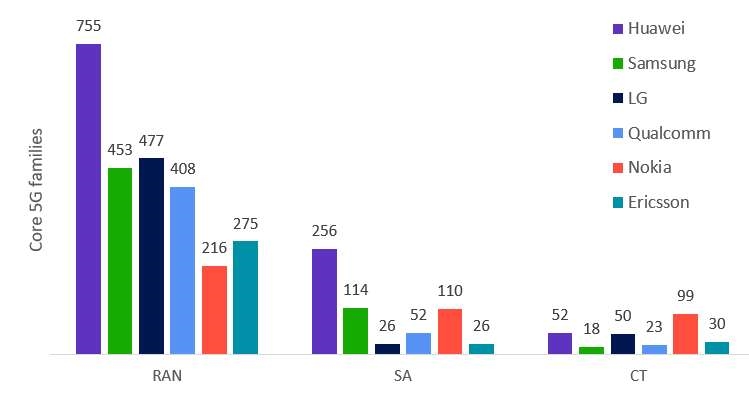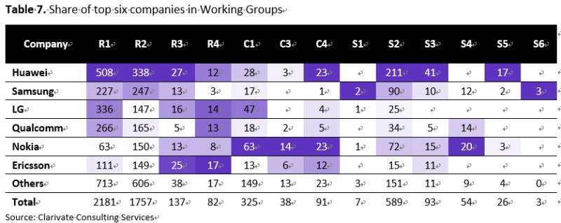 在技術(shù)領(lǐng)域分布方面,華為在RAN TSG的5G核心標(biāo)準(zhǔn)必要專利持有量遠(yuǎn)高于其他公司,在SA TSG和CT TSG領(lǐng)域的5G核心標(biāo)準(zhǔn)必要專利持有量也名列前茅。具體到工作組中,華為在R1、R2、R3、C4、S2、S3和S5等多個(gè)工作組中均擁有最多的5G核心專利族。
