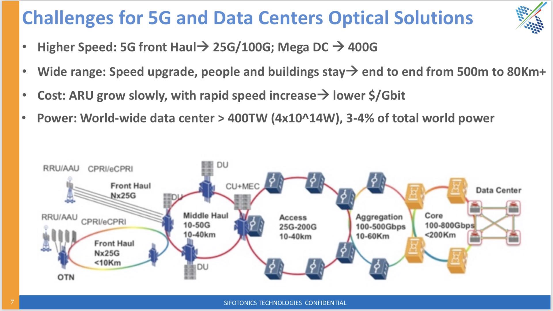 小結一下:SiFotonics開發(fā)的鍺硅光芯片已開始在端到端的5G光網絡得到應用,可覆蓋從5G前傳25G,中傳50G,回傳100G/200G中用到的雪崩二極管芯片,城域數據中心互聯的100G-400G相干芯片,及大數據中心內部互聯的400G硅光芯片。