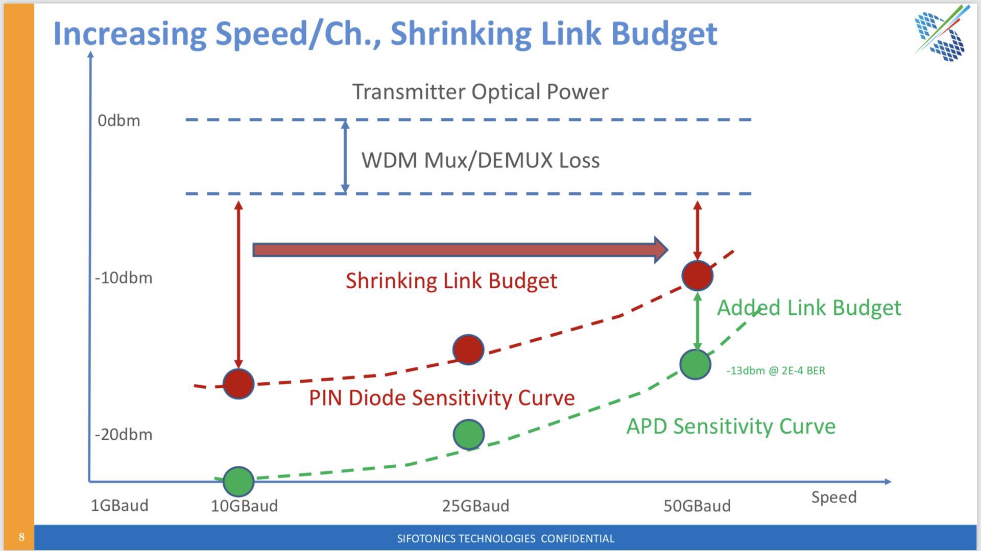 最近SiFotonics已推出業(yè)內領跑的單波100G雪崩二極管接收器。經測試,在標準糾錯誤碼線上可以達到額外的3dB的増益。這項結果給單波100G增遠應用提供堅實的技術基礎,可以擴展到400G 10km, 甚至未來800G的應用。
