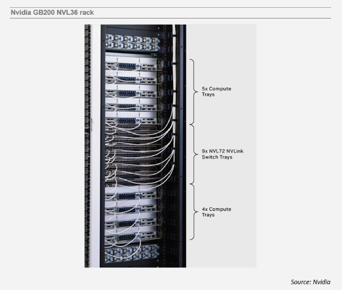 許多客戶更偏愛耗電較少的NVL36配置,而不是需要巨大電力支持(每機架120千瓦)的NVL72配置。對于讀者來說,關(guān)鍵的區(qū)別在于,機架中間顯示的NVLink交換托盤具有前面板籠子,而用于NVL72的“不可擴展”NVLink交換托盤只有用于NVLink脊/背板的后面板連接器。盡管英偉達(dá)省略了布線細(xì)節(jié),但外部NVLink線纜可能包括無源(DAC)和有源銅(ACC/AEC)以及可插拔光學(xué)器件。NVL36為布線創(chuàng)造了一個新的市場細(xì)分,盡管短期內(nèi)主要針對銅纜。
