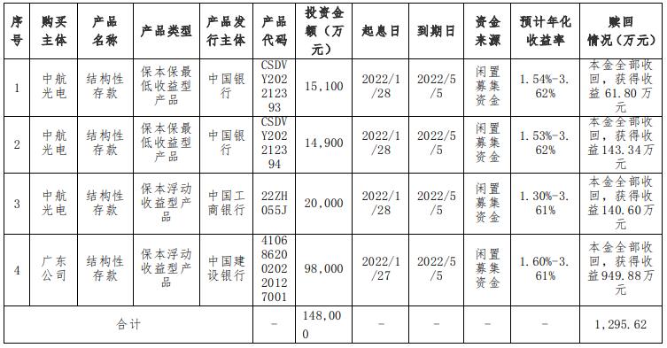 此外,公告還披露了截至本公告日的中航光電前十二個月累計使用募集資金進(jìn)行現(xiàn)金管理的具體情況,詳情如下: