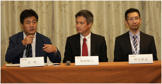 (左至右)大中國(guó)區(qū)三菱電機(jī)半導(dǎo)體高頻光器件應(yīng)用技術(shù)課經(jīng)理王煒先生、三菱電機(jī)半導(dǎo)體亞洲區(qū)銷售總監(jiān)増?zhí)锝≈?/a>先生及三菱電機(jī)光器件部總經(jīng)理杉立厚志博士