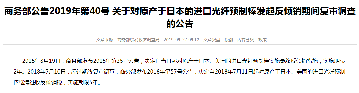 據(jù)悉,2015年8月19日,商務(wù)部發(fā)布2015年第25號(hào)公告,決定自當(dāng)日起對(duì)原產(chǎn)于日本、美國(guó)的進(jìn)口光纖預(yù)制棒實(shí)施最終反傾銷措施,實(shí)施期限2年。2018年7月10日,經(jīng)過期終復(fù)審調(diào)查,商務(wù)部發(fā)布2018年第57號(hào)公告,決定自2018年7月11日起對(duì)原產(chǎn)于日本、美國(guó)的進(jìn)口光纖預(yù)制棒繼續(xù)征收反傾銷稅,實(shí)施期限5年。
