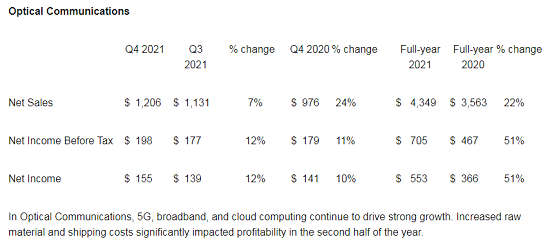 康寧尋求通過提供提高網(wǎng)絡(luò)能力并減少部署時(shí)間和成本的無源光學(xué)解決方案來持續(xù)創(chuàng)造新產(chǎn)品并擴(kuò)大其領(lǐng)先地位。在寬帶、5G和云計(jì)算支出的增長驅(qū)動(dòng)下,2021年第四季度,康寧光通信業(yè)務(wù)銷售收入同比增長24%至12.06億美元;2021年全年,康寧光通信銷售收入增長22%至43億美元。第四季度凈收入為1.55億美元,通過增長10%;2021年全年凈收入5.53億美元,年增51%。康寧表示,原材料和運(yùn)輸成本的增加顯著影響了下半年的盈利能力。