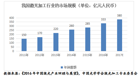 2016年度,中國有超過65萬臺中小功率激光加工裝備應用于激光焊接、打孔、打標等領域;中功率激光切割機、焊接機裝機量過萬臺;高功率激光機床的裝機量超過2300臺。2011年以來,我國激光加工行業(yè)的市場規(guī)模持續(xù)增長,到2016年已達到333億元,具體情況如下: