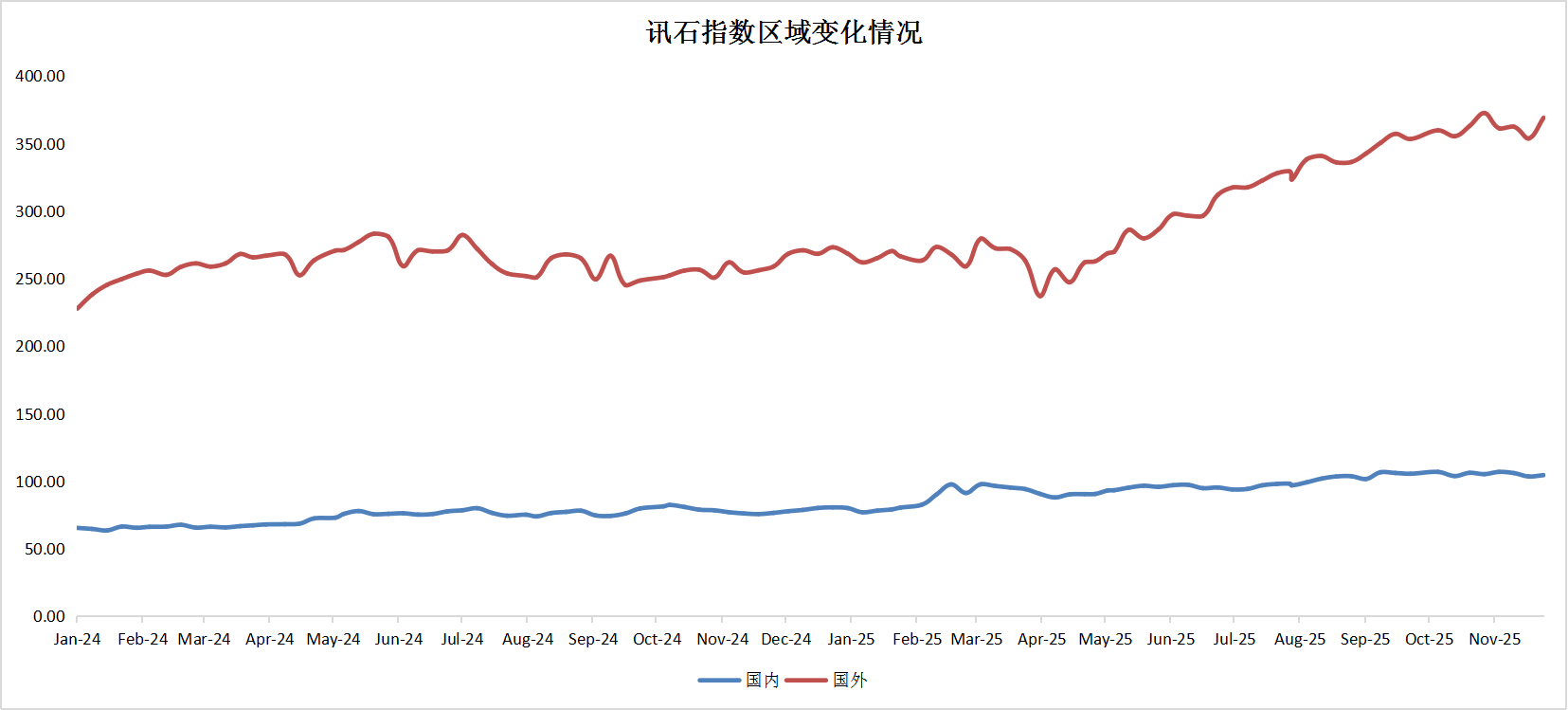 按地區(qū)劃分,截止到11月28日,ICC所統(tǒng)計的國內通信指數(shù)為104.41,環(huán)比略微下滑。國外通信指數(shù)為369.05,較上月下滑0.95%。國外股指在波折中,呈現(xiàn)向上增長的趨勢。