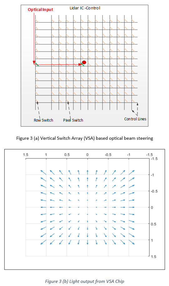 OPA或機(jī)械反射鏡光束轉(zhuǎn)向的替代解決方案是采用光通信領(lǐng)域的硅光子光交叉(OXC)連接技術(shù)。這種方案使來(lái)自低成本、固定激光器的光被耦合進(jìn)硅芯片,并在垂直于硅芯片之前通過(guò)光開(kāi)關(guān)進(jìn)行2D路。這種方案實(shí)際上在硅芯片上構(gòu)造了一個(gè)2D垂直開(kāi)關(guān)陣列(VSA)(圖3a)。當(dāng)硅芯片放置在透鏡的焦平面上時(shí),片上2D路由轉(zhuǎn)換為2D光束轉(zhuǎn)向(圖3b)。與由發(fā)射器重建遠(yuǎn)場(chǎng)光束輪廓的OPA不同,在VSA架構(gòu)中,硅芯片中的光及其遠(yuǎn)場(chǎng)光束輪廓保持其單模特性。與機(jī)械掃描器不同,VSA架構(gòu)支持按需接入每個(gè)發(fā)射器,從而提供多RIO跟蹤。