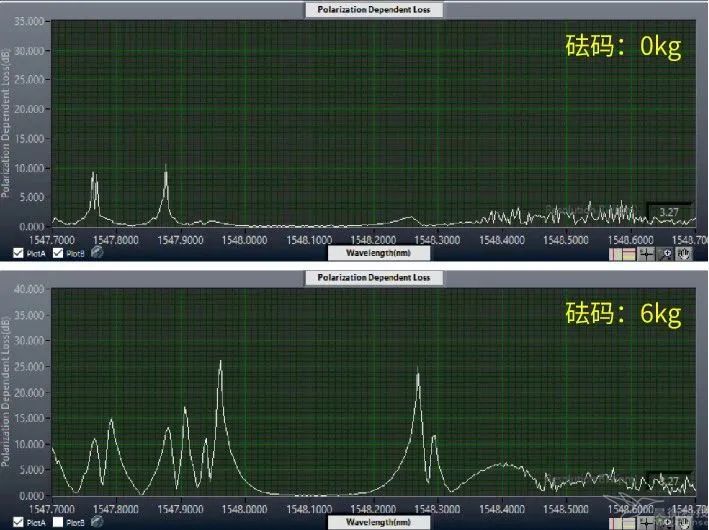 FBG在沒有壓力時(shí)中心波長附件光波段的PDL趨近于0,施加壓力后中心波長附近兩端出現(xiàn)兩個(gè)峰值,隨著壓力逐漸增大,波峰峰值越來越大,在壓力達(dá)到60KN時(shí)波峰出現(xiàn)最大值。OCI-V光學(xué)矢量分析系統(tǒng)能夠同時(shí)測量光學(xué)網(wǎng)絡(luò)損耗、偏振、色散等信息,分析光器件在寬譜、精細(xì)波長下的損耗和時(shí)延。其功能強(qiáng)大、操作方便,在光器件的研發(fā)、生產(chǎn)全過程中發(fā)揮重要作用,為改善設(shè)計(jì)、優(yōu)化結(jié)構(gòu)和評估工藝等提供可靠依據(jù)。