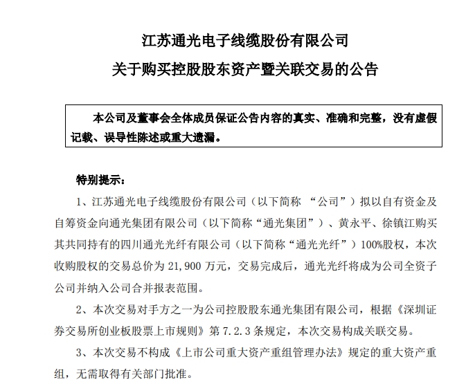 ICC訊(編輯:Vicki)江蘇通光電子線纜股份有限公司(以下簡稱 “公司”)擬以自有資金及自籌資金向通光集團(tuán)有限公司(以下簡稱“通光集團(tuán)”)、黃永平、徐鎮(zhèn)江購買其共同持有的四川通光光纖有限公司(以下簡稱“通光光纖”)100%股權(quán),本次收購股權(quán)的交易總價(jià)為 21,900 萬元,交易完成后,通光光纖將成為公司全資子公司并納入公司合并報(bào)表范圍。