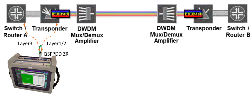 現(xiàn)網(wǎng)ZR設(shè)備建設(shè)與開(kāi)通:在部署和開(kāi)通階段可以采用ONA1000便攜式儀表進(jìn)行QSFPDD ZR的驗(yàn)證測(cè)試: