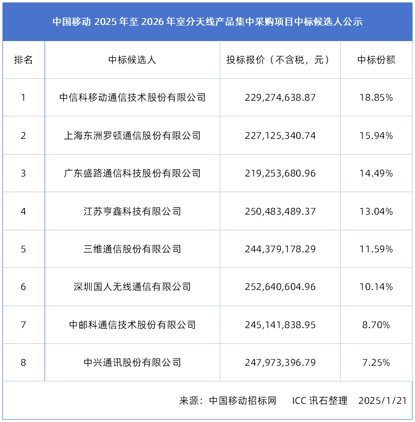 ICC訊 近日,中國(guó)移動(dòng)于官網(wǎng)公示了2025年至2026年室分天線產(chǎn)品集中采購(gòu)項(xiàng)目的中標(biāo)候選人。據(jù)了解,本輪集采共有8家廠商中標(biāo),平均不含稅報(bào)價(jià)約為人民幣2.4億元。