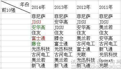 ICCSZ訊(編輯:Debi)近日,隨著2014年中國|全球光通信最具競爭力企業(yè)10強(qiáng)榜單的出爐,外界對光通信各類“前10強(qiáng)”的關(guān)注度也水漲船高起來。盡管關(guān)于該榜單的可信度眾說紛紜,但是訊石小編寧可信其有,并綜合整理了近四年來光通信各類“前10強(qiáng)”的榜單變化情況,意外地發(fā)現(xiàn),有些企業(yè)從此退出“前10強(qiáng)”舞臺;也有些企業(yè)低調(diào)到只在榜單中出現(xiàn),其他時候并未聽過更多有關(guān)其消息,悄無聲息把錢賺;更多的則是,“只在本地吃香”,放之全球則黯然。
