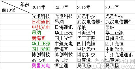 毫無懸念,光迅科技穩(wěn)坐第一。日海通訊近兩年層層拔高,已升至第二名;中航光電排名上升不奇怪,做軍工的競爭力非同一般;昂納則降至第四;華工正源、四川光恒排名分別降兩位;奧雷光電是四年來首次入榜,建于建于2001年的奧雷光電的光通信器件具有從器件的封裝,到光纖耦合組件,到光電轉(zhuǎn)換模塊的縱向集成的技術(shù)和開發(fā)能力。令小編意外的是,新海宜這家靠政府補(bǔ)貼拉高利潤的企業(yè)竟然在排名上連年上升,有點(diǎn)難解。