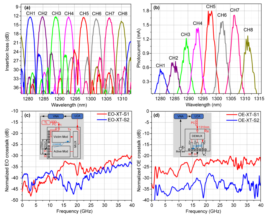 進一步地,本研究對實際工作時存在的電光(EO)和光電(OE)串擾進行了詳細測試,如圖2所示。在40GHz的頻率范圍內(nèi),所有歸一化的EO串擾均遠低于-30dB,表明即使在考慮兩個EO串擾可能在調(diào)制器的差分工作中累積的情況下,EO串擾對發(fā)射機性能的影響也微乎其微。在接收端,由于器件間距較小,OE串擾水平高于EO串擾。具體而言,相鄰光電探測器(PD)之間的串擾水平低于-20dB,而不相鄰PD之間的串擾水平低于-30dB。這些結(jié)果表明,為了進一步降低串擾,未來的設(shè)計中應(yīng)考慮選擇更大的器件間距,以優(yōu)化系統(tǒng)的整體性能。