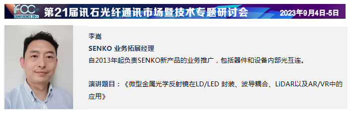 屆時(shí),扇港元器件有限公司(SENKO)業(yè)務(wù)拓展經(jīng)理李嵩將在第21屆訊石研討會(huì)上9月4日專題六《通信半導(dǎo)體芯片、材料發(fā)展》發(fā)表主題為《微型金屬光學(xué)反射鏡在LD/LED 封裝、波導(dǎo)耦合、LiDAR以及AR/VR中的應(yīng)用》的演講,SENKO收購(gòu)了光學(xué)領(lǐng)域的精密沖壓公司Cudoform, 并整合其產(chǎn)品技術(shù)為金屬光學(xué)平臺(tái)。該技術(shù)平臺(tái)使用開創(chuàng)性的沖壓技術(shù),可在金屬表面形成定位結(jié)構(gòu)和光反射曲面。定位結(jié)構(gòu)支持亞微米級(jí)光纖定位或無源耦合。反射面粗糙度為數(shù)納米,可實(shí)現(xiàn)光束自由整形和轉(zhuǎn)向。本次演講介紹該技術(shù)平臺(tái)的原理和歷史, 并報(bào)告其產(chǎn)品在不同領(lǐng)域的應(yīng)用情況。