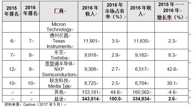 表一、2016年全球收入前十大半導(dǎo)體廠商(單位:100萬(wàn)美元)