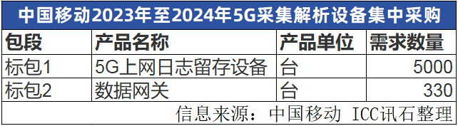 ICC訊 1月10日,中國移動采購與招標網(wǎng)獲悉,中國移動2023年至2024年5G采集解析設(shè)備集中采購主要新增采集解析設(shè)備122T、轉(zhuǎn)發(fā)接收網(wǎng)關(guān)3.7T,項目共劃分2個標包,具體標包劃分如下:
