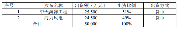 公告顯示,合資公司注冊資本為人民幣 50,000 萬元,中天海洋工程出資 25,500 萬元,占注冊資本的 51%,海力風(fēng)電出資 24,500 萬元,占注冊資本 49%。