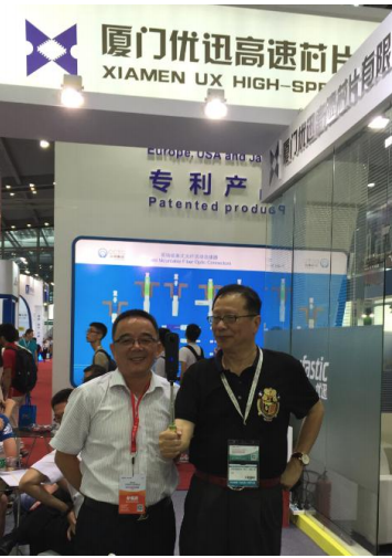 Iccsz訊(編輯:Aiur)9月7日,熱鬧紛繁的CIOE 2016進(jìn)入到第二天。訊石團(tuán)隊(duì)有幸參訪了廈門(mén)優(yōu)迅高速芯片有限公司(下稱(chēng)優(yōu)迅)展廳。展位號(hào)是1B53,歡迎光通訊同仁蒞臨指導(dǎo)與交流。作為多年的老朋友,優(yōu)迅董事長(zhǎng)柯總及其他領(lǐng)導(dǎo)接待了訊石團(tuán)隊(duì)的參訪,在訊石石總與柯總親切的交談中,訊石也見(jiàn)識(shí)到優(yōu)迅在國(guó)產(chǎn)光通訊芯片的最新成果與貢獻(xiàn)。