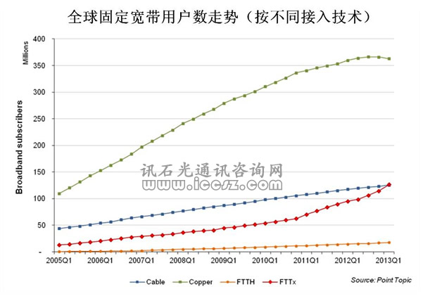 基于銅線的寬帶服務(wù)包括DSL、ADSL和ADSL2+。Point Topic的統(tǒng)計(jì)范圍還包括Cable用戶數(shù)、FTTx/VDSL和FTTH用戶。