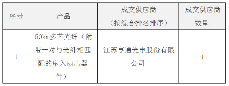 ICC訊 中國(guó)電信研究院已于日前公示了2022年云網(wǎng)融合承載網(wǎng)基礎(chǔ)設(shè)施建設(shè)項(xiàng)目-中國(guó)電信研究院50km多芯光纖的采購結(jié)果,江蘇亨通光電獨(dú)家中標(biāo)。