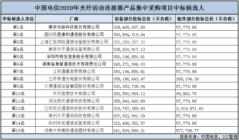 ICC訊 (編輯:Aiur)12月18日,中國(guó)電信發(fā)布2020年光纖活動(dòng)連接器產(chǎn)品集中采購(gòu)項(xiàng)目中標(biāo)候選人結(jié)果,華脈科技、天邑康和、上海匯玨、特發(fā)信息、通鼎寬帶、亨通光電、中天寬帶等15家ODN廠家入圍中標(biāo)候選人。