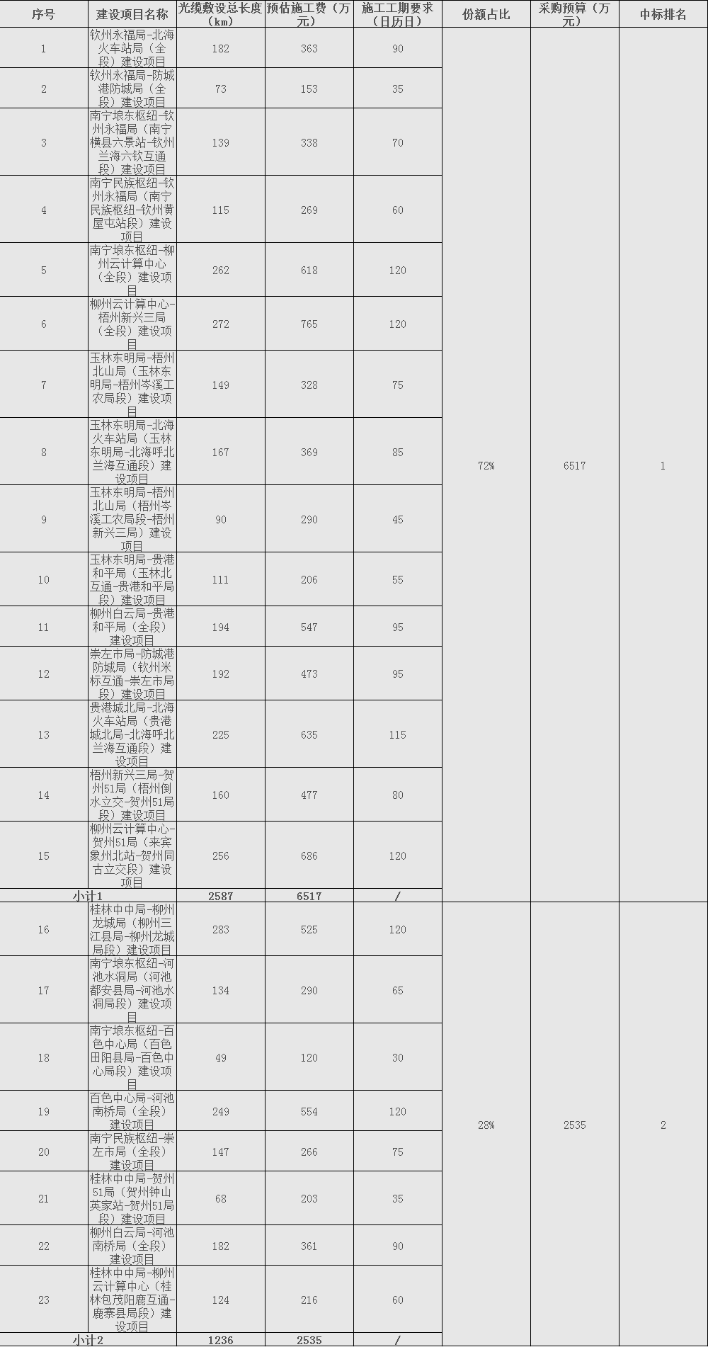 ICC訊(編輯:Anton)6月8日,中國電信廣西公司發(fā)布《2020-2021年中國電信廣西公司二干高速公路光纜線路建設(shè)施工采購項(xiàng)目招標(biāo)公告》,招標(biāo)代理編號:05-09-04A-2020-D-A07702。投資預(yù)算共計(jì)人民幣9052萬元(不含增值稅價(jià)),共計(jì)新建二干光纜23條,纖芯容量以大芯數(shù)144/288芯為主。光纜主要經(jīng)現(xiàn)有通信管道敷設(shè),建設(shè)總長度約3821皮長公里,其中:租用高速公路通信管道敷設(shè)約3071公里,城區(qū)內(nèi)通信管道敷設(shè)約668公里,其他方式(直埋/架空)敷設(shè)約82公里;OA站進(jìn)、出局配套管道約6.9公里,折合約6.9管孔公里。具體建設(shè)規(guī)模以工程施工圖設(shè)計(jì)文件為準(zhǔn)。