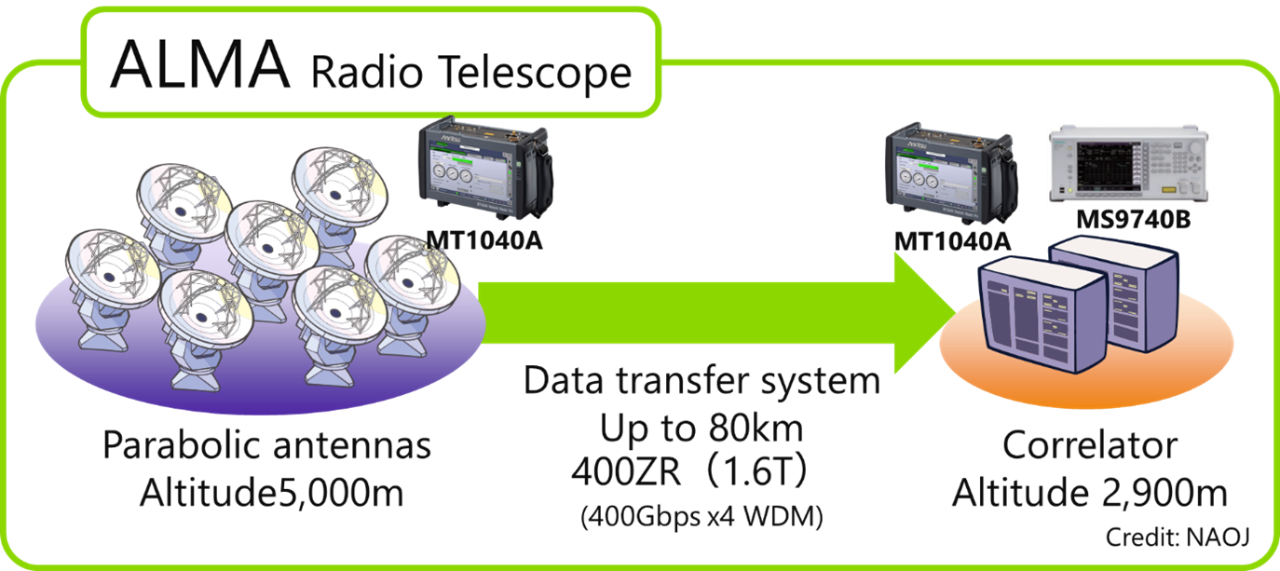 NAOJ深度參與了ALMA的運營,ALMA由包括日本在內(nèi)的22個國家和地區(qū)的全球伙伴關(guān)系監(jiān)督,負責(zé)提高射電望遠鏡的性能,使其進入2030年代(寬帶靈敏度升級(WSU))。NAOJ正在與美國國家射電天文臺(NRAO)合作,使用400ZR標(biāo)準(zhǔn)實現(xiàn)天線(射電望遠鏡)和相關(guān)器(超級計算機)之間的大量觀測數(shù)據(jù)通信,目前正在考慮1.6 Tbps的高速通信。與400ZR標(biāo)準(zhǔn)兼容的MT1040A被選擇用于評估DTS;MT1040A具有以一秒間隔顯示物理層測量結(jié)果、允許詳細評估大量天文數(shù)據(jù)傳輸質(zhì)量的功能。此外,已選擇MS9740B在DTS評估期間監(jiān)測傳輸信號的光波長。