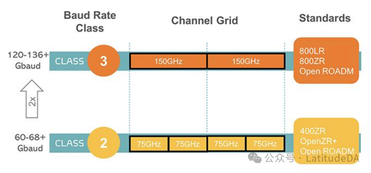 圖1. 2類約60+G波特到3類約120+G波特的波特率和信道間距的2倍擴(kuò)展 (Source: Cisco)