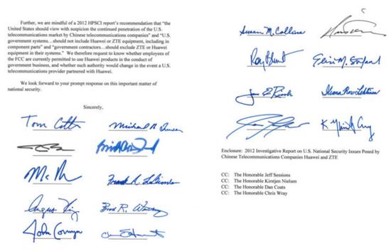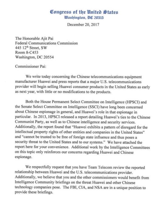 ICCSZ訊  2018年CES第一天,來自外媒的彭博社稱華為手機未能與AT&T達成合作協(xié)議。之后就有媒體曝光了“美國18名國會議員聯(lián)名致信聯(lián)邦通信委員會(FCC)主席艾吉特·帕伊(Ajit Pai)”的郵件,主要內(nèi)容是,要求FCC對華為與美國運營商的合作展開調(diào)查。并認為是該郵件導(dǎo)致了雙方合作流產(chǎn)。