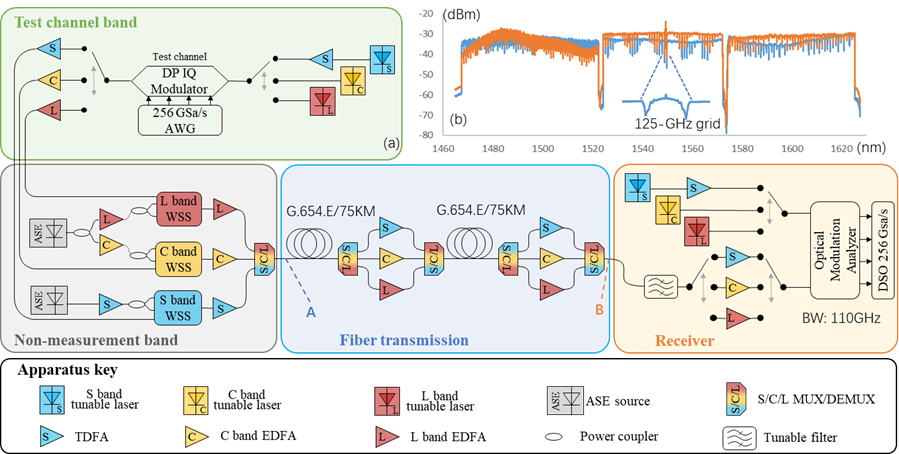 高光帶寬方面:在波分復(fù)用傳輸系統(tǒng)中,光帶寬越高,所能容納的通道數(shù)就越多,傳輸容量越大。本工作每個通道所占光帶寬為125GHz,S波段60個通道(7.5THz光帶寬),C波段48個通道(6THz光帶寬),L波段48個通道(6THz光帶寬),使用的光帶寬總計19.5THz,處于行業(yè)領(lǐng)先水平。限制光帶寬的一個重要因素在于放大器的增益范圍,本工作使用了武漢光迅科技股份有限公司開發(fā)的EDFA(摻鉺光纖放大器)。其中C波段EDFA增益帶寬可達6THz,噪聲指數(shù)低于5.8;L波段EDFA增益帶寬可達6THz,噪聲指數(shù)低于8.5。