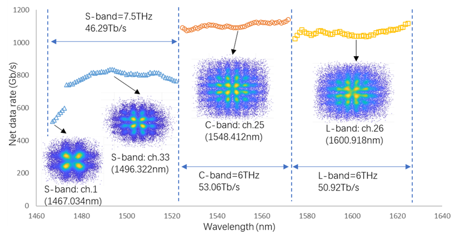 相較于常見的波分復(fù)用相干光傳輸實驗,本工作在超高單波速率、使用集中式放大、高光帶寬三個方面呈現(xiàn)出亮點。