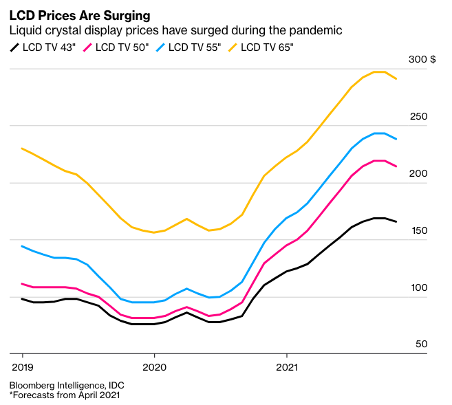 顯示驅(qū)動芯片的短缺導(dǎo)致了液晶面板價格的飆升。去年1月到今年3月,一塊50英寸液晶電視面板的售價增長了一倍。彭博行業(yè)研究分析師馬修·坎特曼(Matthew Kanterman)預(yù)計,液晶面板價格將不斷上漲,一直持續(xù)到今年第三季度。他指出,顯示驅(qū)動芯片遭遇了“可怕的短缺”。
