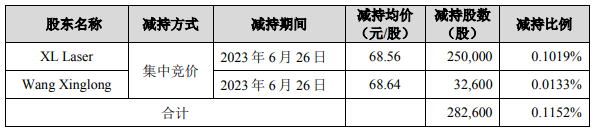 此前2023年6月26日,公司披露了《關(guān)于股東減持股份實施情況的公告》(公告編號:2023-045),公司股東XL Laser及Wang Xinglong先生該次減持合計282,600股,減持數(shù)量過半。具體內(nèi)容詳見巨潮資訊網(wǎng)(www.cninfo.com.cn)的相關(guān)公告。