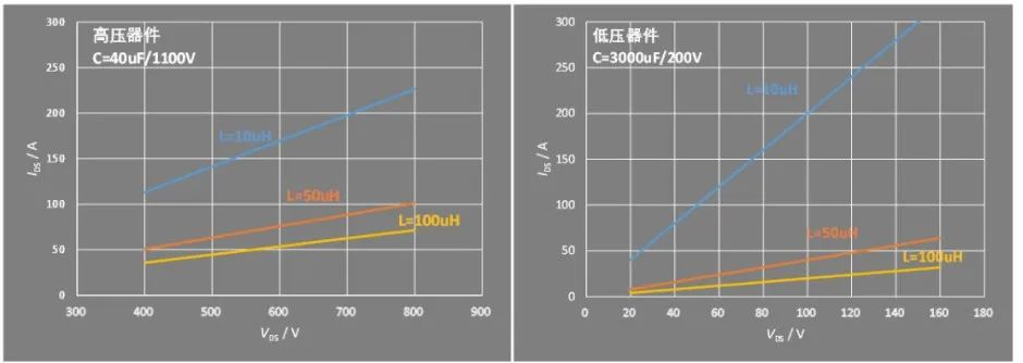 高壓器件為了滿足高壓的測試需求,須選擇耐壓值高的母線電容,但此類電容容值較小,如用該電容來測試低壓器件,能夠實現(xiàn)的最大電流將大打折扣。對于功率器件來說,耐壓和導通電阻是一對矛盾的關系,低壓器件往往需要更大測試電流,所以低壓器件應選擇容值更大的母線電容。此外,由上圖可知,在測試電壓相同,負載電感越小可實現(xiàn)的最大電流值越大,為了滿足低壓器件大電流的要求,也應選擇感量更小的負載電感。