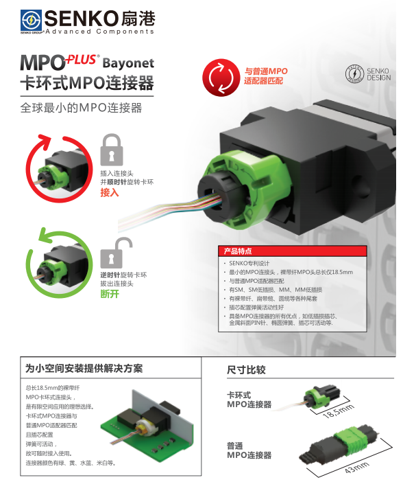此外,扇港重點展示的還有一款針對小空間安裝的卡環(huán)式MPO連接器(MPO PLUS Bayonet)。扇港聲稱,這款全球最小的MPO連接器是業(yè)界內(nèi)最小的MPO連接器,裸帶纖MPO頭總長僅18.5mm(普通MPO連接器為43mm)。這款MPO可與普通MPO適配器匹配,是有限空間應(yīng)用的理想選擇。該插芯配置彈簧活動性好,且具備MPO連接器的所有優(yōu)點,如低插損插芯、金屬斜面PIN針、橢圓彈簧、插芯可活動等。