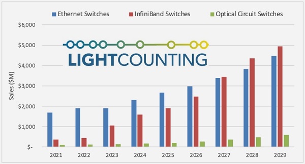 ICC訊(編譯:Nina)近日,LightCounting(LC)更新了其針對云數(shù)據(jù)中心的《以太網(wǎng)、InfiniBand和光交換機》報告。