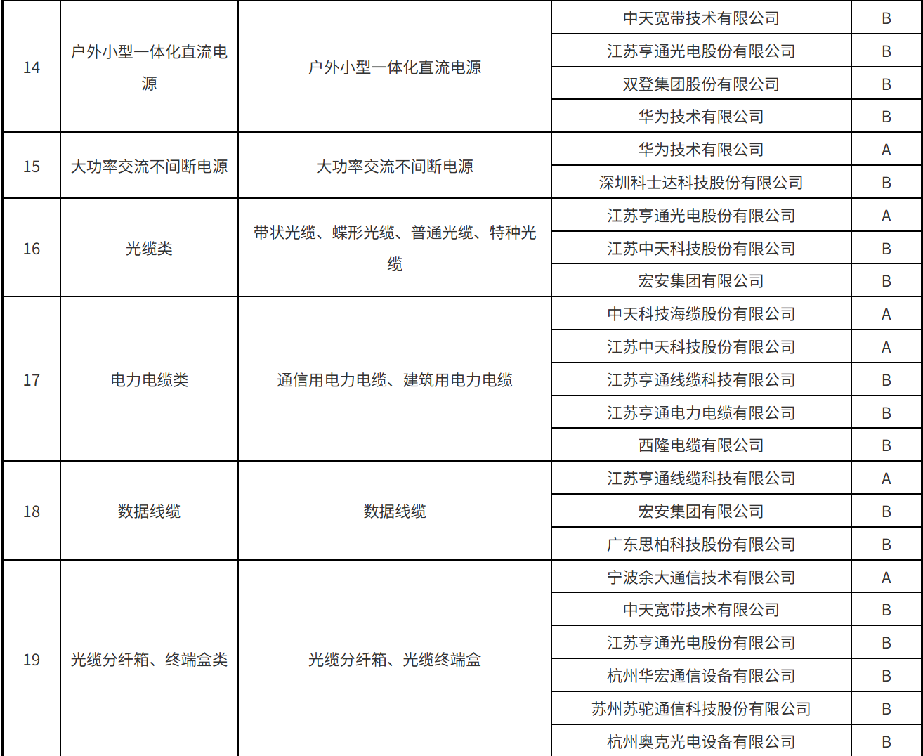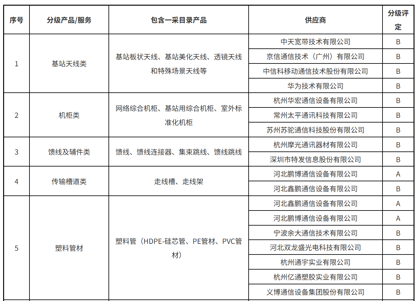 本次公示涵蓋了光纜類、光纖分纖箱/終端盒類、光纜交接箱/配線架類、光纜接頭盒、軟跳纖類、光分路器、數(shù)據(jù)線纜、基站前傳設備、數(shù)據(jù)中心/中低端交換機、智能家庭網(wǎng)關、基站天線類、機柜類等34個產(chǎn)品服務。A、B級供應商名單具體的分級結果如下: