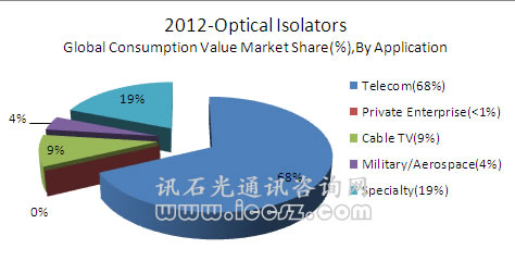 ElectroniCast預(yù)計電信應(yīng)用將占2012年全球光隔離器消費(fèi)值68%的相對市場份額。目前的市場和技術(shù)活動中超過35個光隔離器供應(yīng)商,2012年在產(chǎn)品開發(fā)和客戶支持上還會有所增長。