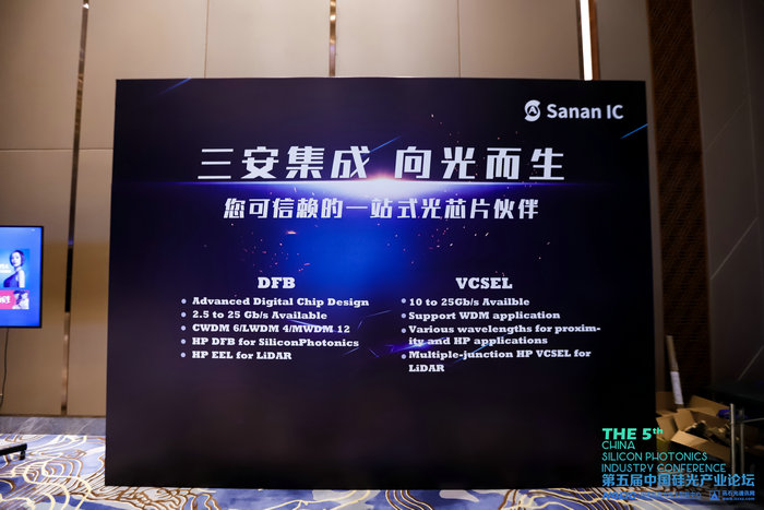 三安集成產(chǎn)品經(jīng)理王迪發(fā)表《大功率HP DFB在硅光領(lǐng)域的應(yīng)用》報(bào)告,三安集成光芯片已在5G網(wǎng)絡(luò)、移動(dòng)終端、新能源、光通信等諸多應(yīng)用中大批量交付。憑借優(yōu)異的產(chǎn)品性能和實(shí)測(cè)可靠性以及準(zhǔn)時(shí)交付能力,獲得全球客戶的信賴。針對(duì)硅光應(yīng)用,三安集成提供40mW/70mW CWDM4/1310nm EEL(DFB),目前40mW HP DFB和70mW HP DFB皆獲得優(yōu)秀測(cè)試數(shù)據(jù),40mW HP DFB已通過(guò)各類雙85°C 2000小時(shí)可靠性測(cè)試。廈門(mén)市超光集成電路有限公司,由 POET Technologies Inc.與廈門(mén)市三安集成電路有限公司合資,于2021 年初成立。通過(guò)采用先進(jìn)的硅光集成封裝技術(shù),開(kāi)發(fā)、制造和提供高速光互聯(lián)產(chǎn)品和解決方案。POET optical interposer 是集成了多種光學(xué)元件的硅光芯片,具有尺寸小、低損耗、溫度不敏感,與CMOS工藝兼容等特點(diǎn)。SPX OE采用先進(jìn)的flip-chip設(shè)計(jì)和混合集成工藝,具有尺寸小、功耗低、成本低和設(shè)計(jì)新穎等特點(diǎn),便于客戶應(yīng)用,并極大地簡(jiǎn)化客戶的產(chǎn)品設(shè)計(jì)。