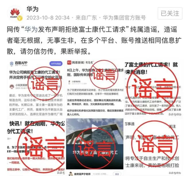 聲明中稱:網(wǎng)傳“華為發(fā)布聲明拒絕富士康代工請(qǐng)求”純屬造謠,造謠者毫無(wú)根據(jù),無(wú)事生非,在多個(gè)平臺(tái)、賬號(hào)推送相同信息擴(kuò)散,請(qǐng)勿信勿傳,果斷舉報(bào)。