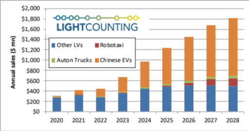 LightCounting預(yù)計(jì),2023-2028年輕型汽車(LV) ADAS應(yīng)用的激光雷達(dá)銷售將快速增長(zhǎng),如下圖所示。在中國(guó)電動(dòng)汽車上部署激光雷達(dá)將引領(lǐng)市場(chǎng)增長(zhǎng)。即使到2028年,Robotaxis和自動(dòng)駕駛卡車仍將是小眾市場(chǎng)。